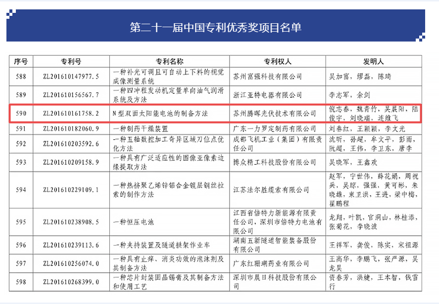 近日,國(guó)家知識(shí)產(chǎn)權(quán)局發(fā)布了第二十一屆中國(guó)專利獎(jiǎng)?lì)A(yù)獲獎(jiǎng)項(xiàng)名單,蘇州騰暉光伏技術(shù)有限公司的“N型雙面太陽能電池的制備方法”(ZL201610161758.2)專利榮獲中國(guó)專利獎(jiǎng)優(yōu)秀獎(jiǎng)。
