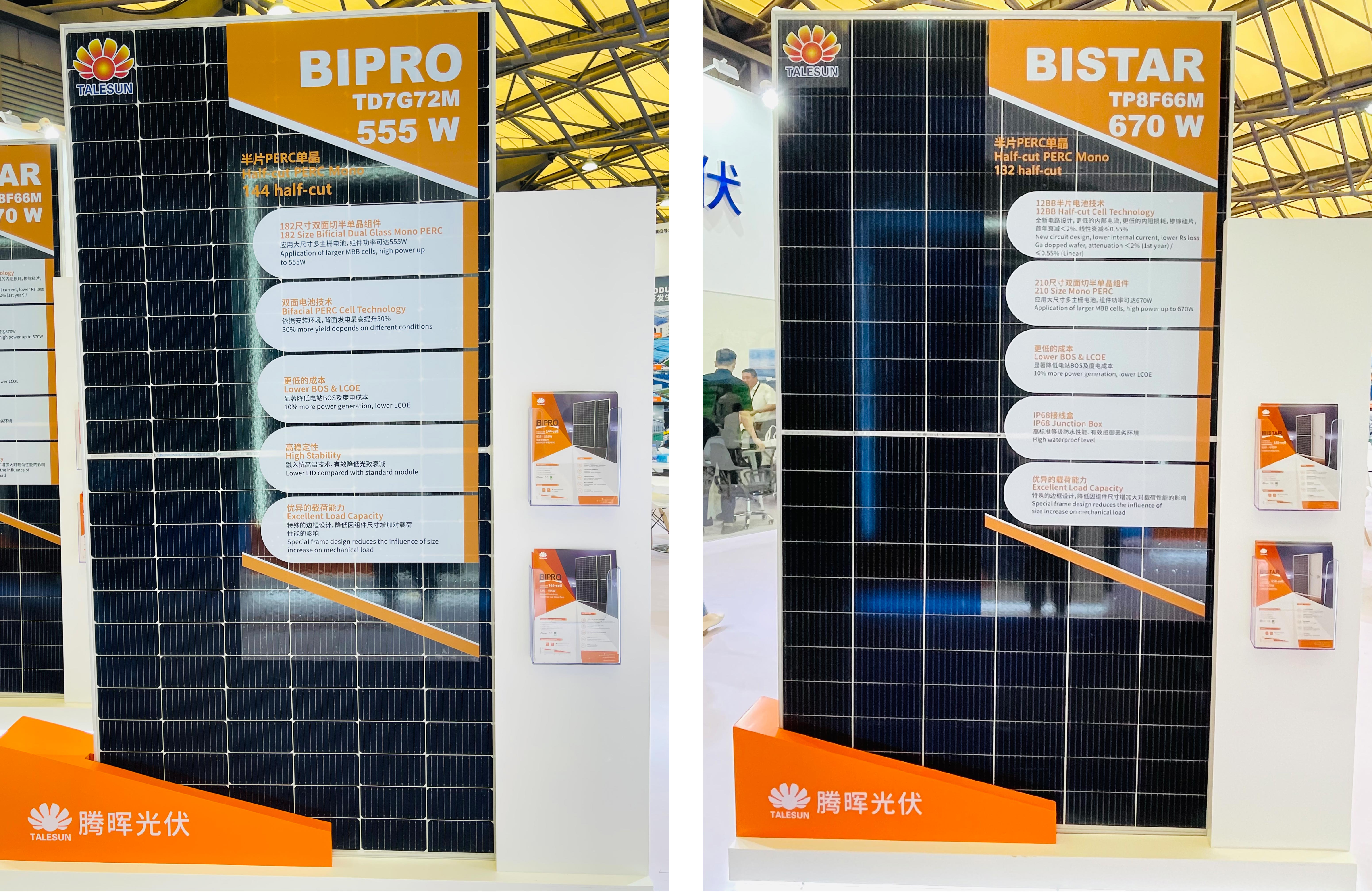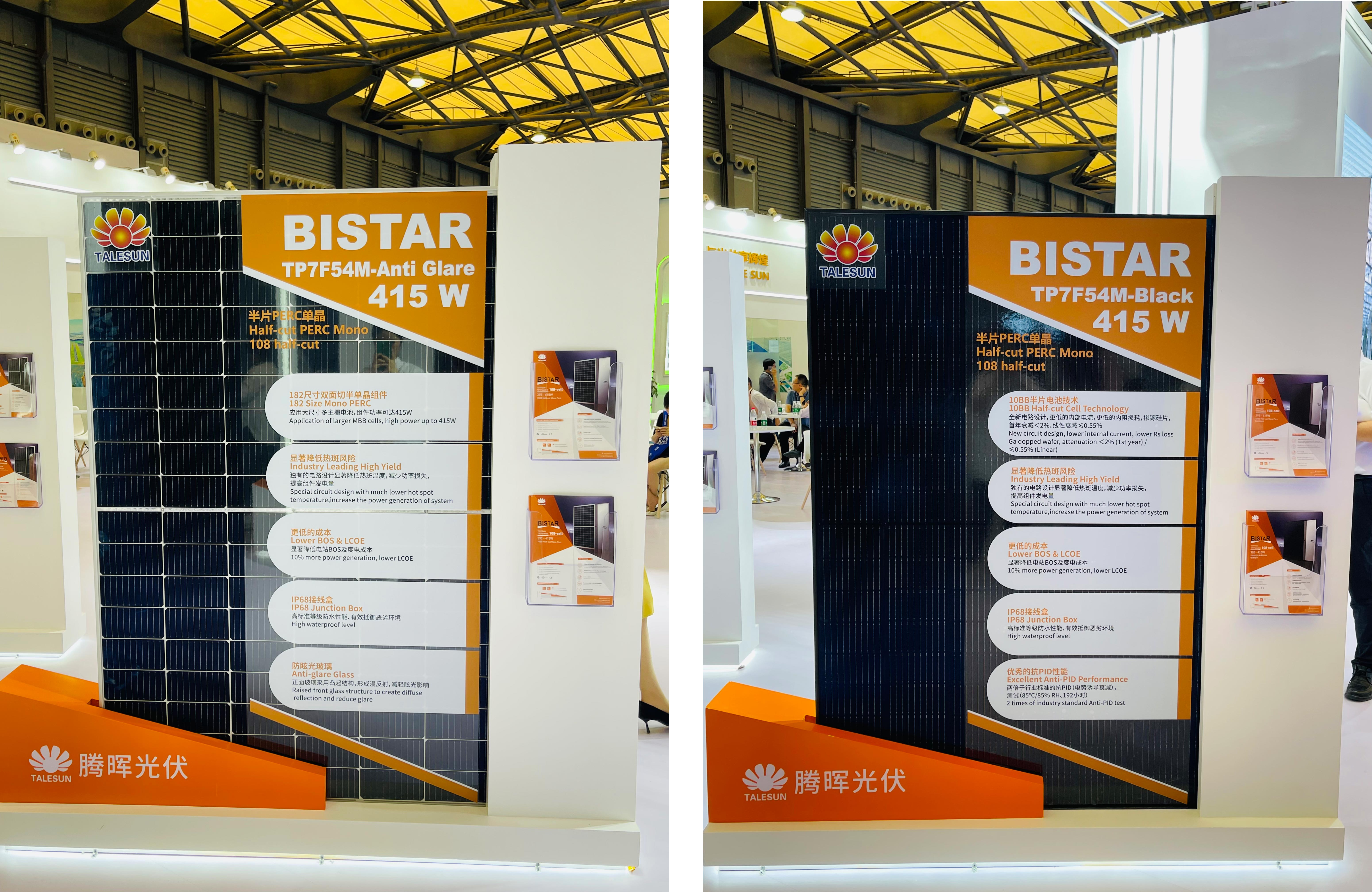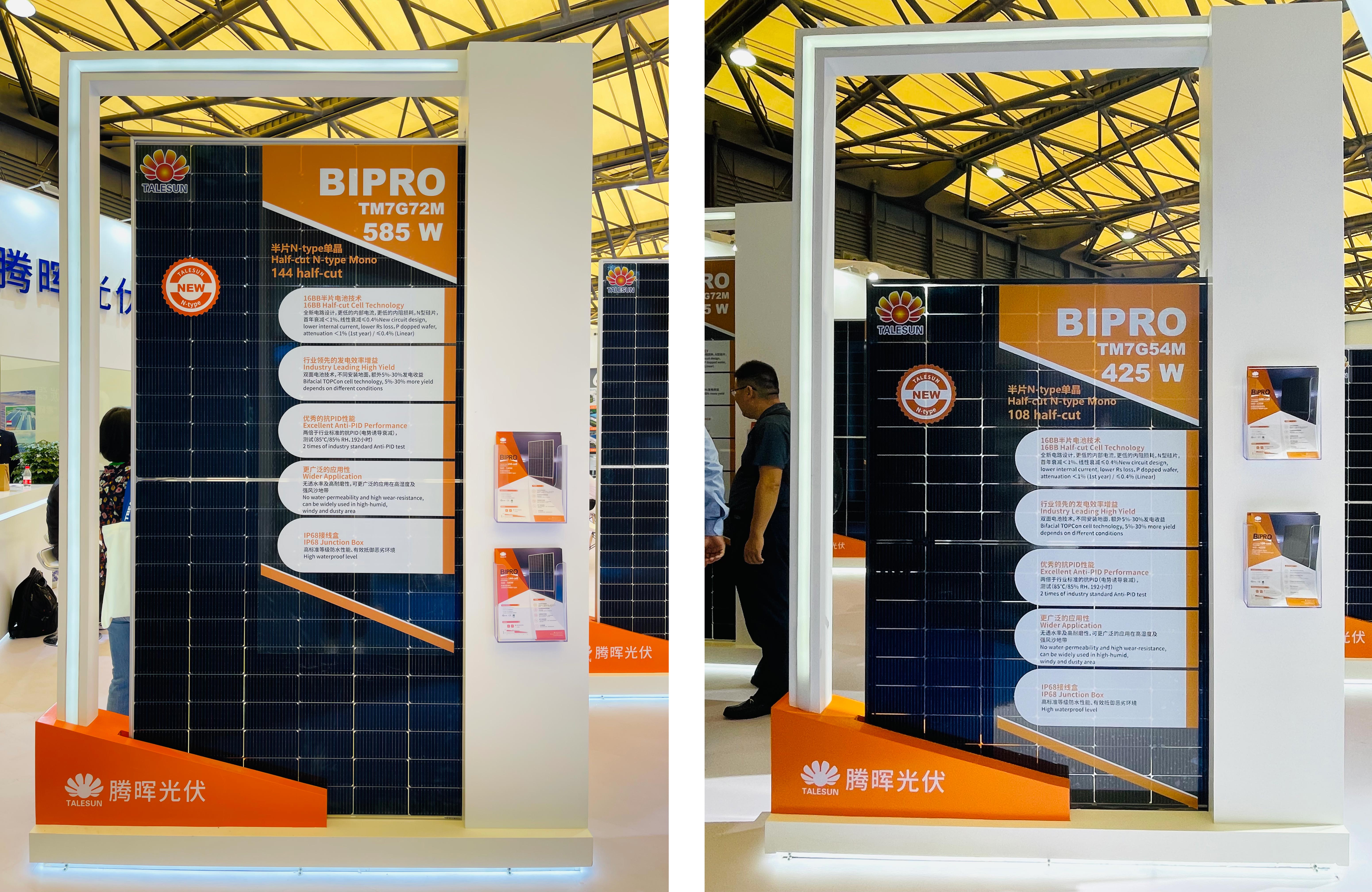 位于 E1-530 展臺(tái)的騰暉光伏,首次攜 N 型組件在國(guó)內(nèi)亮相,正式宣布進(jìn)入“N”時(shí)代。此次展出兩款組件分別為:BIPRO_TM7G72M 及 BIPRO_TM7G54M。由于 N 型組件更低的溫度系數(shù)、更高的雙面率、更低光致衰減等方面的發(fā)電性能優(yōu)勢(shì),比起常規(guī) P 型組件來(lái)說(shuō)在相同直流側(cè)容量下帶來(lái)至少 3%的發(fā)電量增益。同時(shí),N 型組件由于更高的轉(zhuǎn)換效率,相應(yīng)降低了所吸收光能的熱轉(zhuǎn)換,從而降低了組件的工作溫度。因此,在提升發(fā)電量的同時(shí),發(fā)電回報(bào)更高、應(yīng)用環(huán)境更廣、更受客戶(hù)青睞。